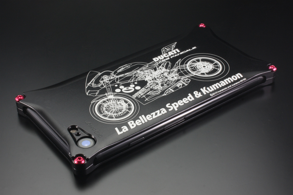 | ブラックボディにレッドボルトでくまモンカラーを表現。 2013年鈴鹿8耐に参戦した ラ・ベレッツァ スピード&くまモンのマシン 「DUCATI 1199 Panigale」をケースにレーザー刻印しました。 |